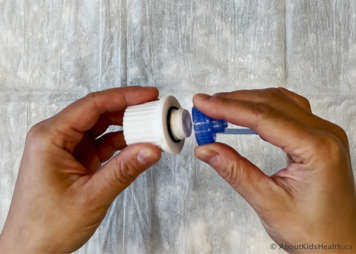 The dissolve-and-dose device also has two parts, a blue screw top with a removable pop-top cap and a tube for the liquid.