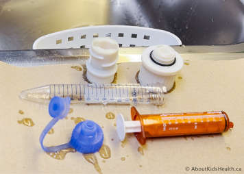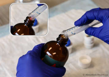 Lift the dissolve-and-dose device until it is upright over the oral syringe. Withdraw the appropriate dose using the oral syringe. Your health-care provider will tell you how much solution to give to your child.