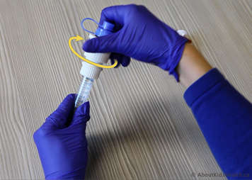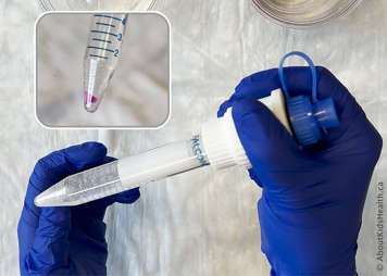 Open the pop-top on the blue cap of the dissolve-and-dose device and place the tip of the oral syringe into the blue cap.